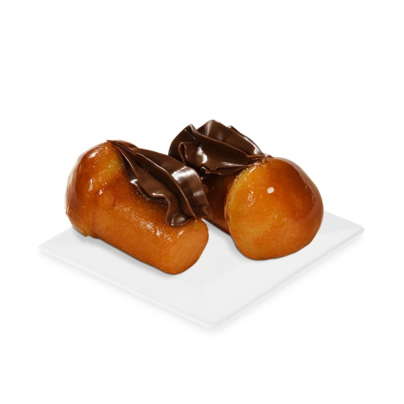 Prodotto dolciario artigianale mignon con pasta lievitata bagnata con liquore al rum e farcita con crema al cacao e nocciole.