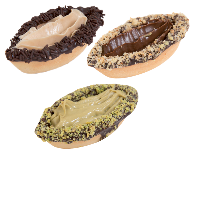 Barchette di frolla assortite granellate e ripiene con crema di nocciola, cioccolato, pistacchio.