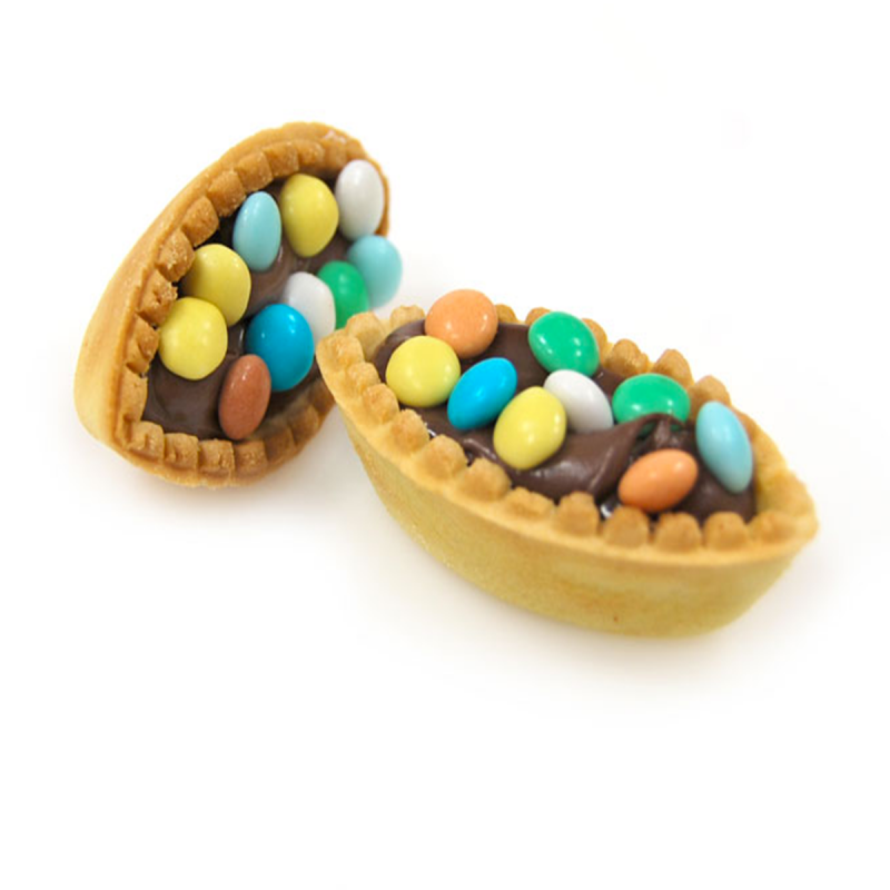 Pasticcini di frolla a forma di barchetta ripieni di crema nocciola cacao e decorati con smarties.