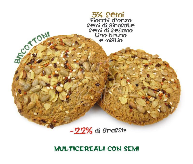 Biscottoni multicereali con fiocchi d’orzo, semi di girasole, semi di sesamo, lino bruno e miglio.