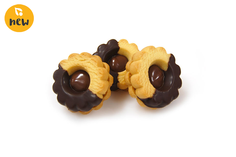 Friabili fiori di pasta frolla glassati e farciti con morbida crema nocciola e cacao.
