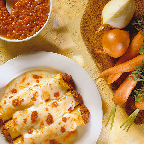 Pasta di semola di grano duro con ripieno di: mortadella,carni bovine preparate,prosciutto cotto,verdure,uova,formaggio Grana Padano,noce moscata,sale,pepe e aromi naturali. Basta sistemare i cannelloni nella pirofila senza scongelarli, condirli a piacere e infornare.