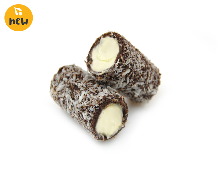 Cannolo di cialda wafer glassato con fondente e decorato con cocco rapè, farcito con crema al cocco.