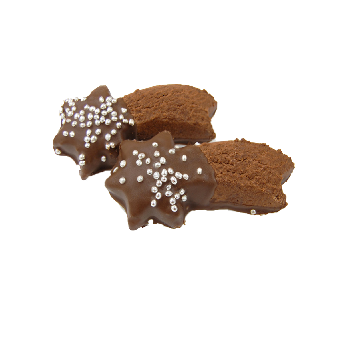 Cometina di frolla al cacao glassata e decorata con momperiglia argentata.