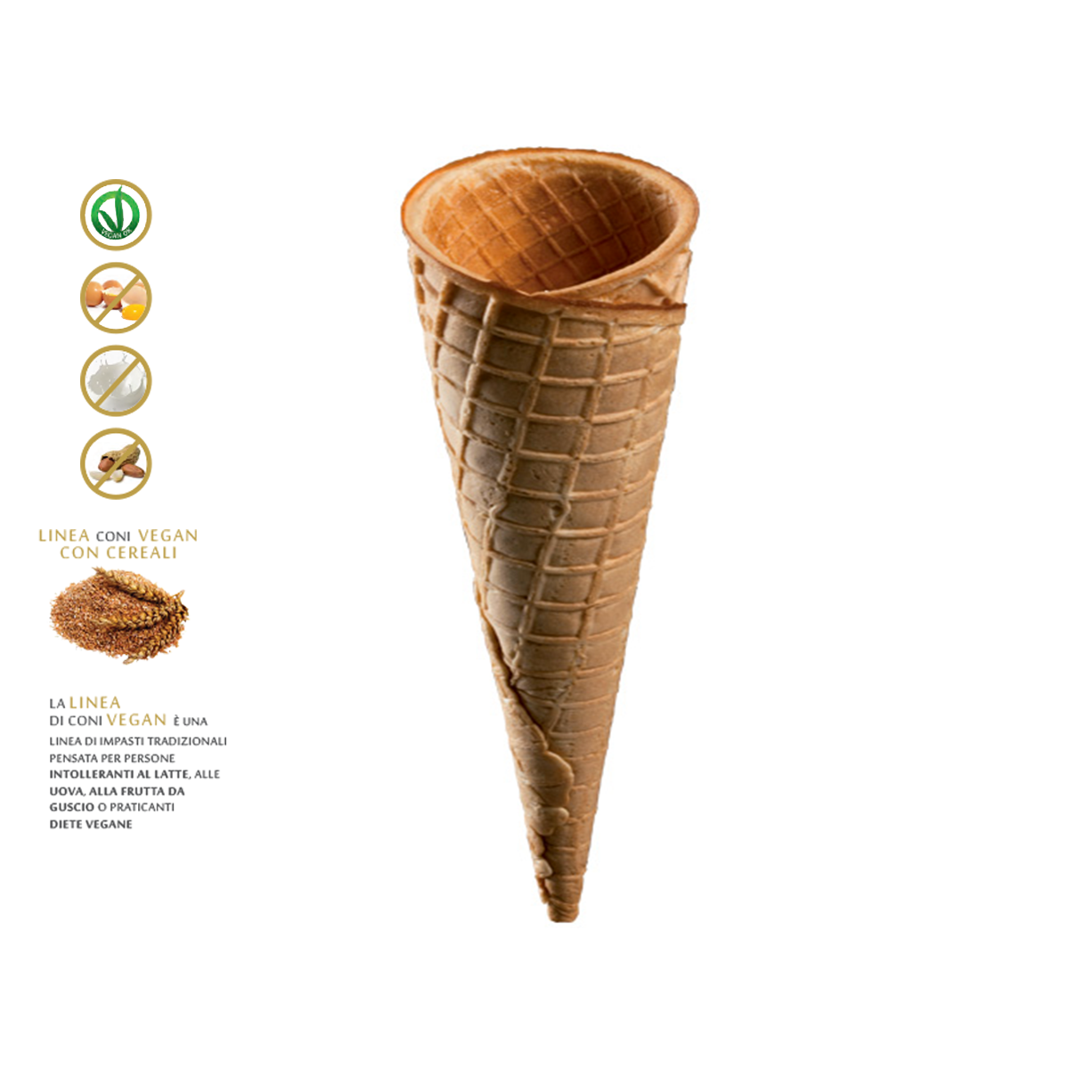 La linea di coni VEGAN con CEREALI è una linea di impasti tradizionali pensata per persone intolleranti al latte, alle uova, alla frutta da guscio o praticanti diete vegane.