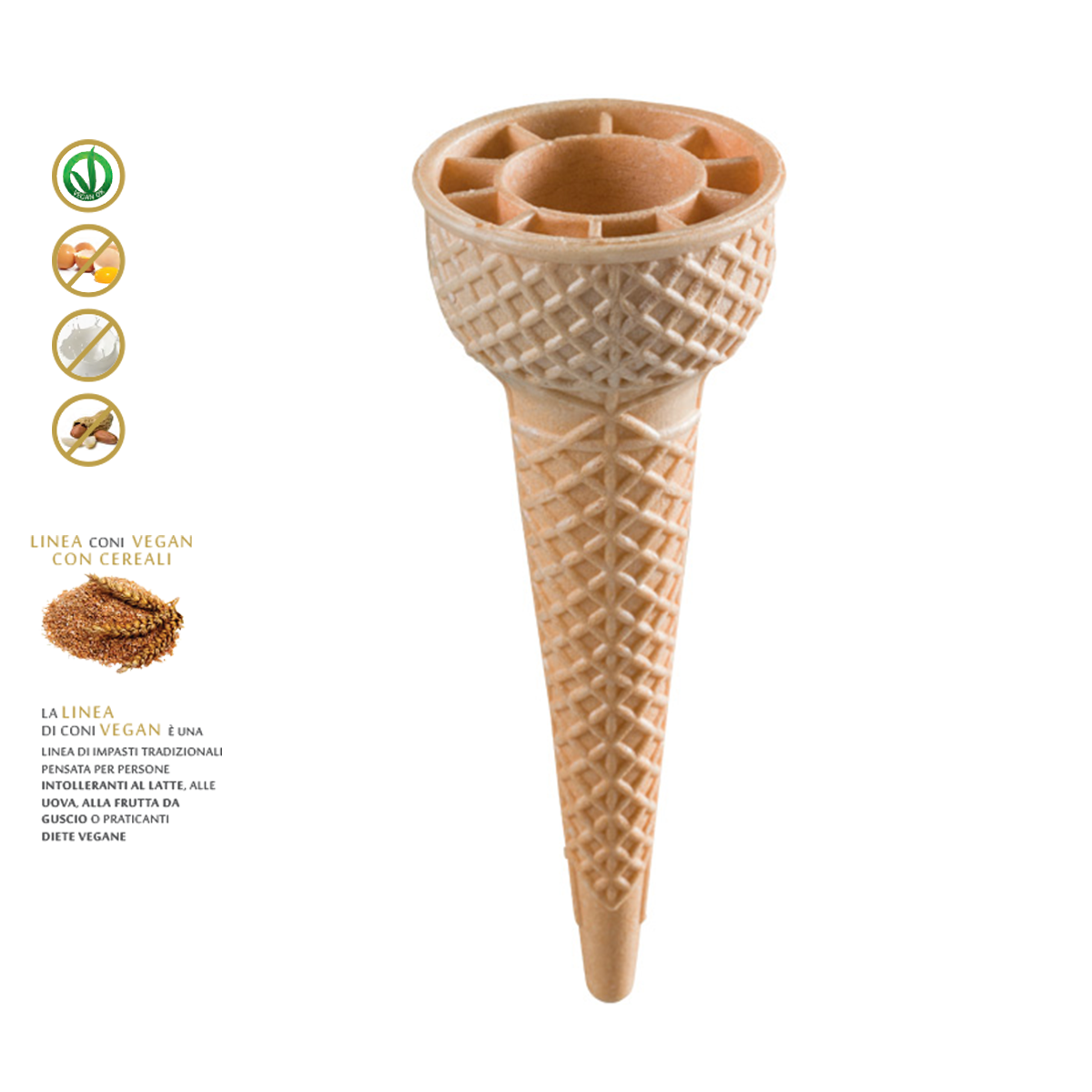 La linea di coni VEGAN con CEREALI è una linea di impasti tradizionali pensata per persone intolleranti al latte, alle uova, alla frutta da guscio o praticanti diete vegane.