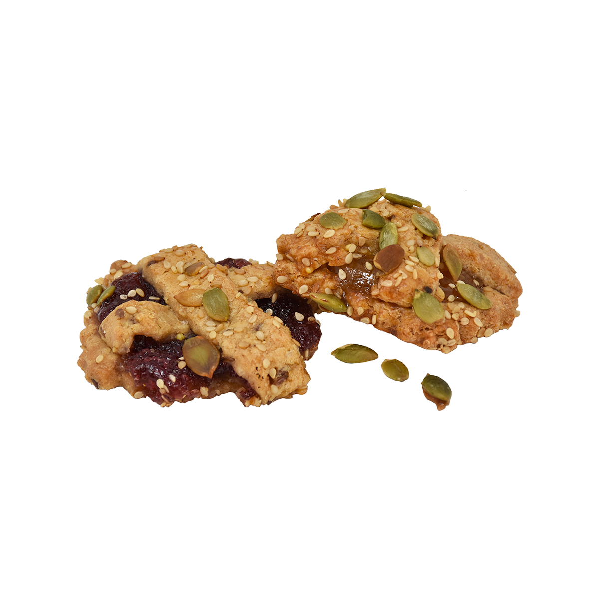 Crostatine integrali farcite con confettura di arance e mirtilli decorati con sesamo e semi di girasole.