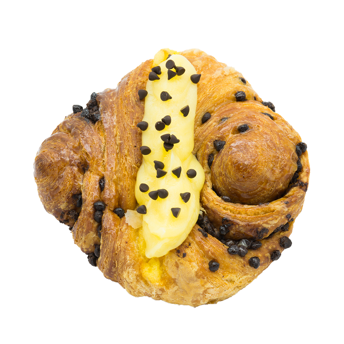 Girelle di morbida pasta sfogliata ripiene di crema pasticcera e gocce di cioccolato.