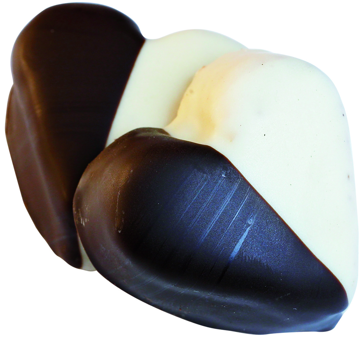 Cuoricino alla mandorla glassato con cioccolato fondente e bianco.