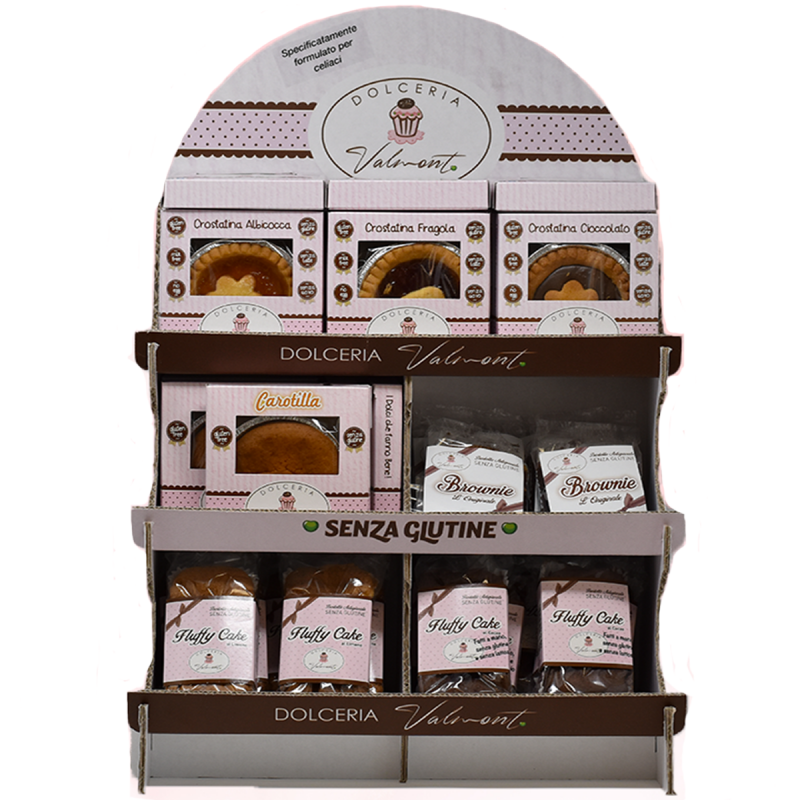 Espositore completo gluten free: Crostatine ciok, Crostatine albicocca, Crostatine fragola, Carotilla, Brownie ciok, Fluffy-cake ciok, Fluffy-cake limone.