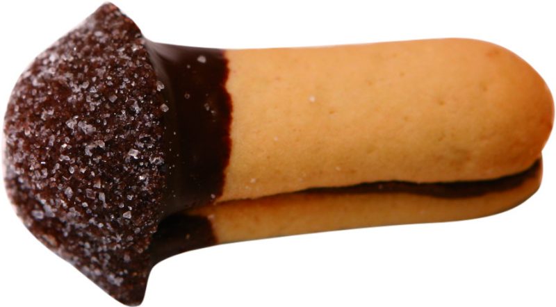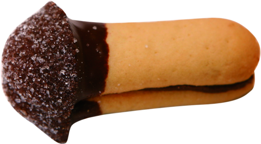 Lingue di frolla accoppiate con ripieno di crema nocciola e cacao,copertura di cioccolato e zuccherate in punta.