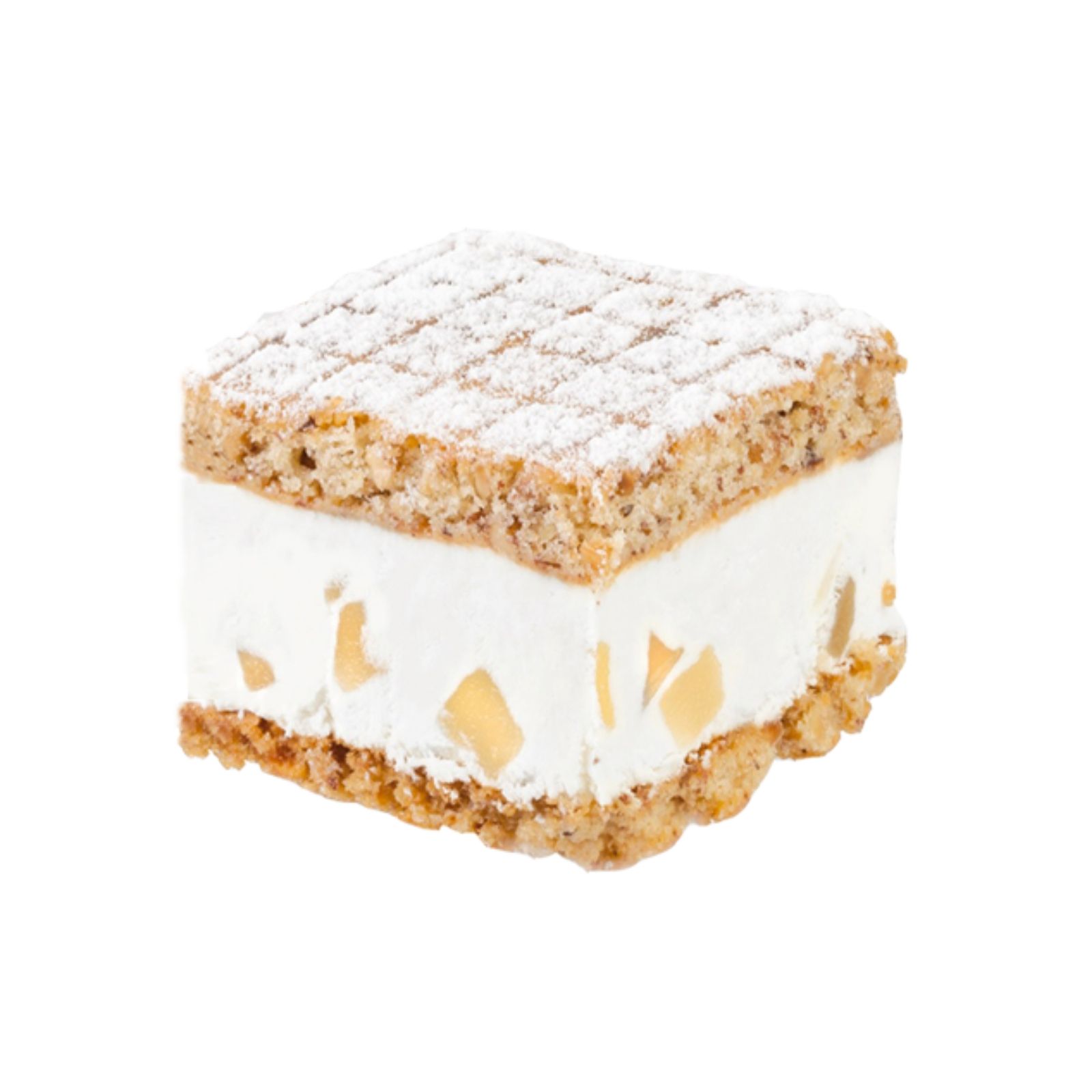 Monoporzione farcita con crema di ricotta arricchita di cubetti di pera candita tra due strati di biscotto alle nocciole spolverato con zucchero a velo.