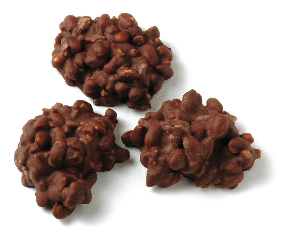 Riso soffiato e granella di nocciole ricoperti da fondente al cacao.