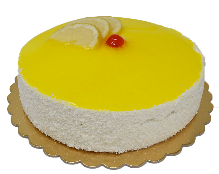 Cremosa mousse ripiena con crema al limone e glassata a specchio.