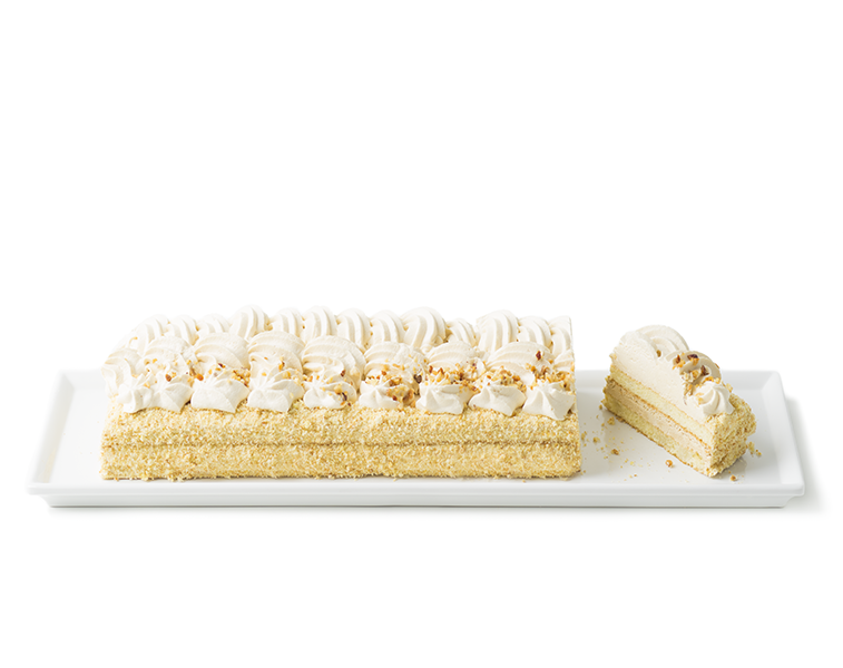 Pan di spagna farcito con gustosa crema alla nocciola e decorato con nocciole tostate.